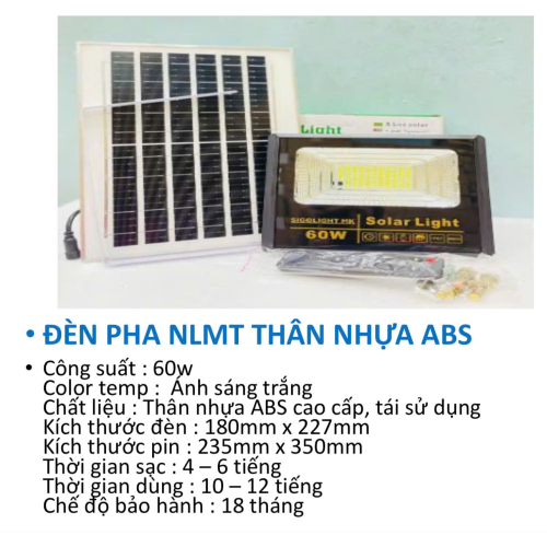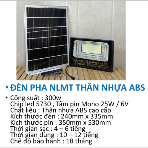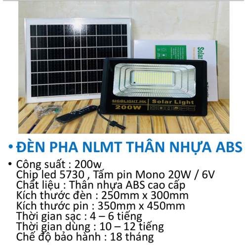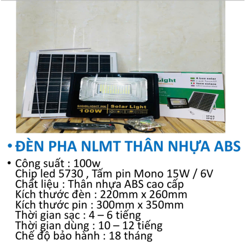 Đèn pha năng lượng mặt trời thân nhựa ABS cao cấp là giải pháp chiếu sáng tiết kiệm và tiện lợi cho không gian ngoài trời. Sản phẩm sử dụng chip LED 5730 siêu sáng kết hợp tấm pin Mono hiệu suất cao, giúp sạc nhanh và chiếu sáng ổn định suốt đêm mà không tốn điện.